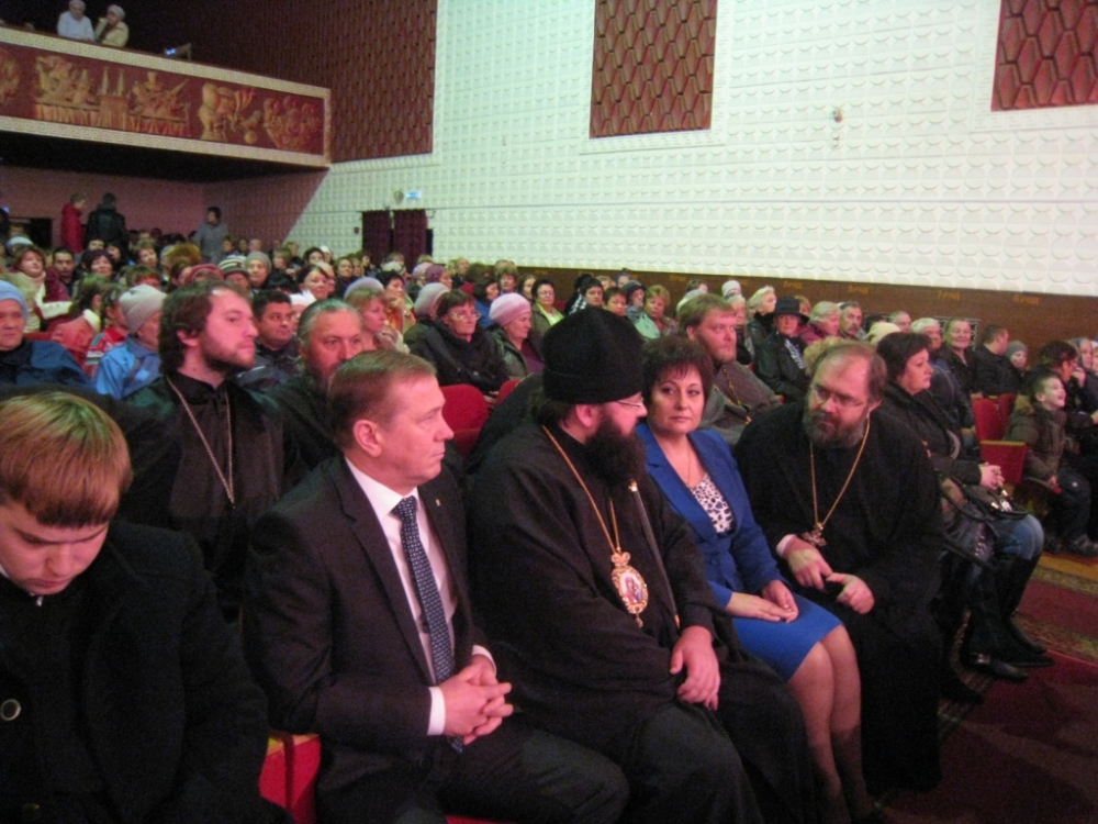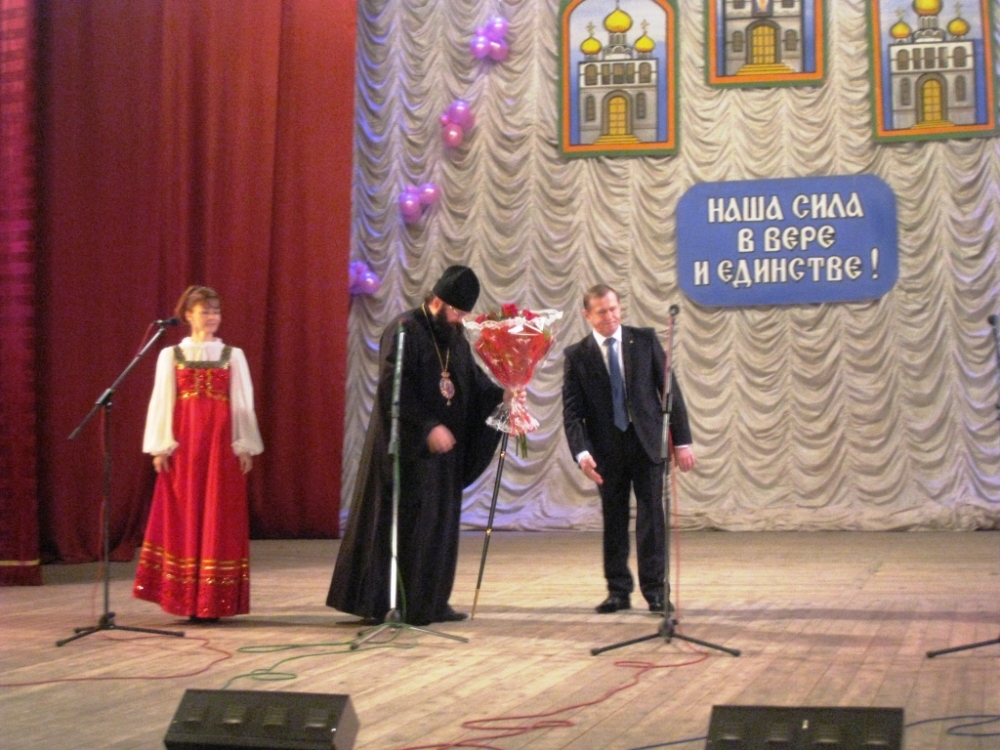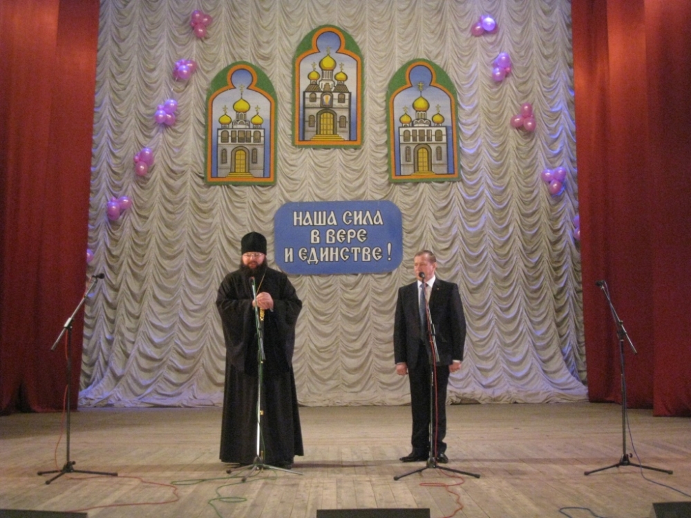 Концерт был открыт выступлением сводного оркестра детской музыкальной школы города Ярцево. После их выступления присутствующих поздравили епископ Смоленский и Вяземский Владыка Исидор и глава Администрации МО «Ярцевский район» Панков Ю.В. В своих словах архипастырь обратил внимание на героизм людей, часто играющий решающую роль в истории нашего государства, но также отметил, что преодолевать многие трудности и лишения нам помогала милость Божия и заступничество Божией Матери. Всем собравшимся в зале Владыка Исидор пожелал крепкой веры, помощи Божией и преподал всем свое архипастырское благословение.