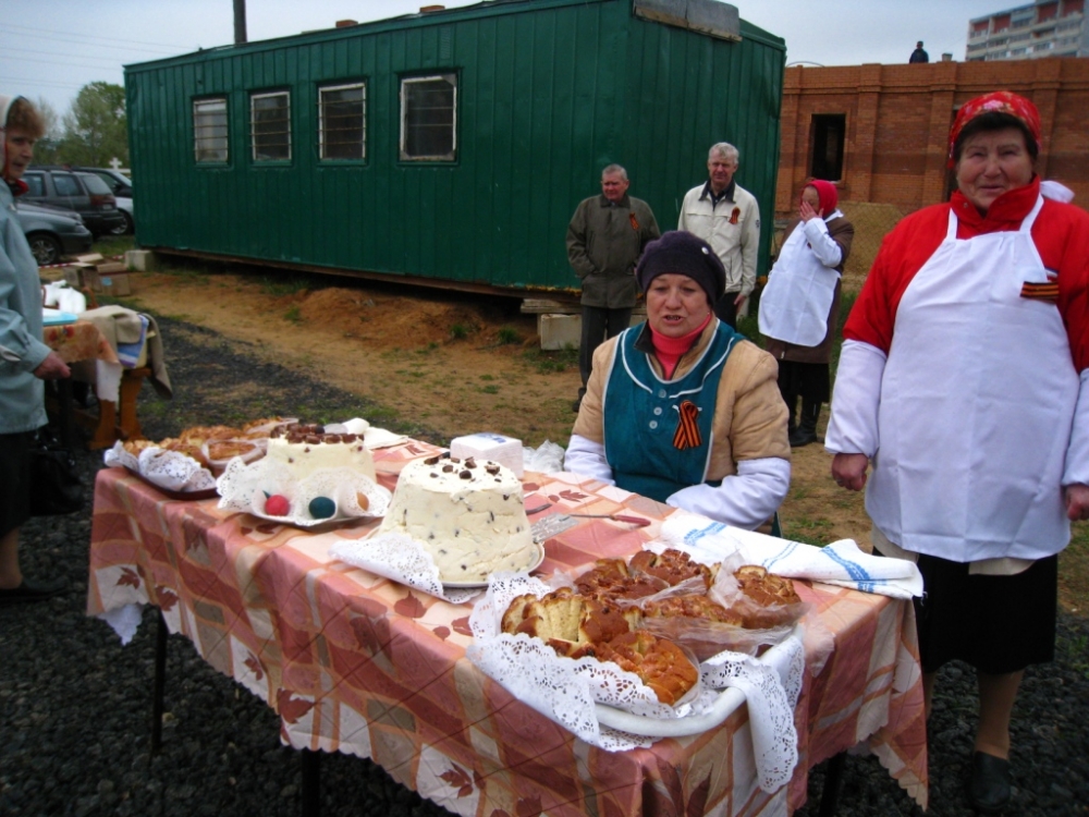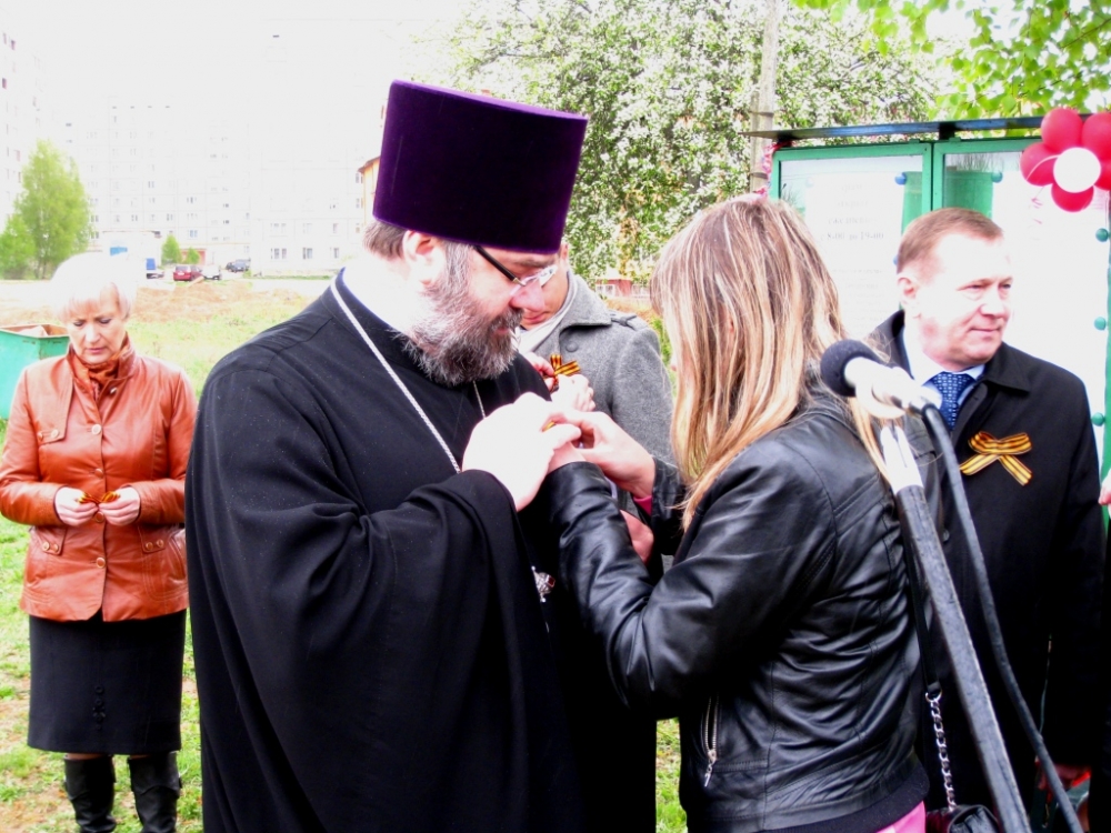 На улице Приходской совет храма приготовил праздничную трапезу и концерт с участием творческих коллективов, который начался со слов приветствия главы Администрации МО «Ярцевский район» Панкова Ю.В. Здесь была прочитана молитва и Преосвященнейший Владыка благословил трапезу и поблагодарил всех, кто не остался безучастным в чужом горе и пожертвовал семье Барановских. Отец Василий объявил о начале акции «Георгиевская ленточка» и ребята раздали всем присутствующим символ победы.