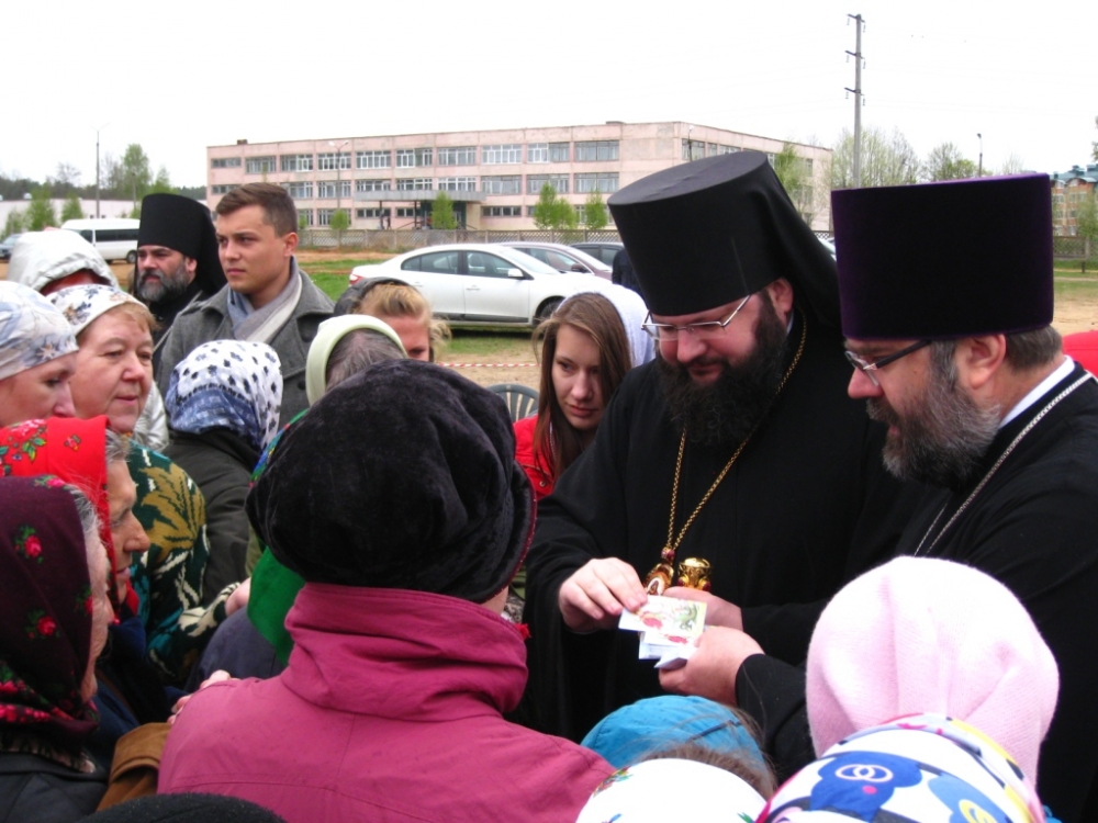 После причащения священников отец Василий Мовчанюк объявил о сборе материальной помощи, которая будет оказана семье Барановских. Квартира и имущество этой семьи пострадало в пожаре, произошедшем в многоквартирном доме в ночь с 3 на 4 мая. Барановский А.В. работает в проектной мастерской, которая на протяжении многих лет сотрудничает с церковью, выполняя архитектурные проекты для строительства храмов и часовен в Ярцевском благочинии. Также батюшка объявил о том, что крестный ход по окончании службы возглавит Смоленский архипастырь владыка Исидор.