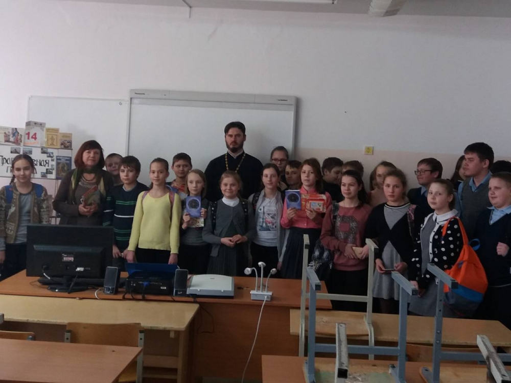 В школе батюшка рассказал об истории книгопечатания на Руси, об особенностях составления и особой роли Богослужебных книг.