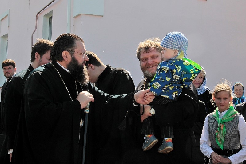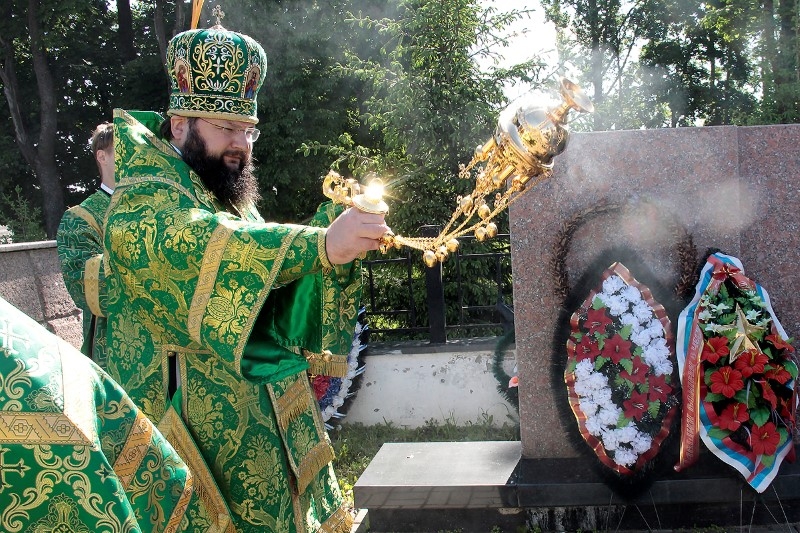 По окончании Литургии архипастырь, духовенство и миряне совершили крестный ход вокруг храма. Во время крестного хода у мемориала погибшим в годы Великой Отечественной войны митрополит Исидор совершил заупокойную литию, а также вместе с Борисом Викторовичем Петифоровым и жителями города возложил цветы к памятнику Советскому солдату.