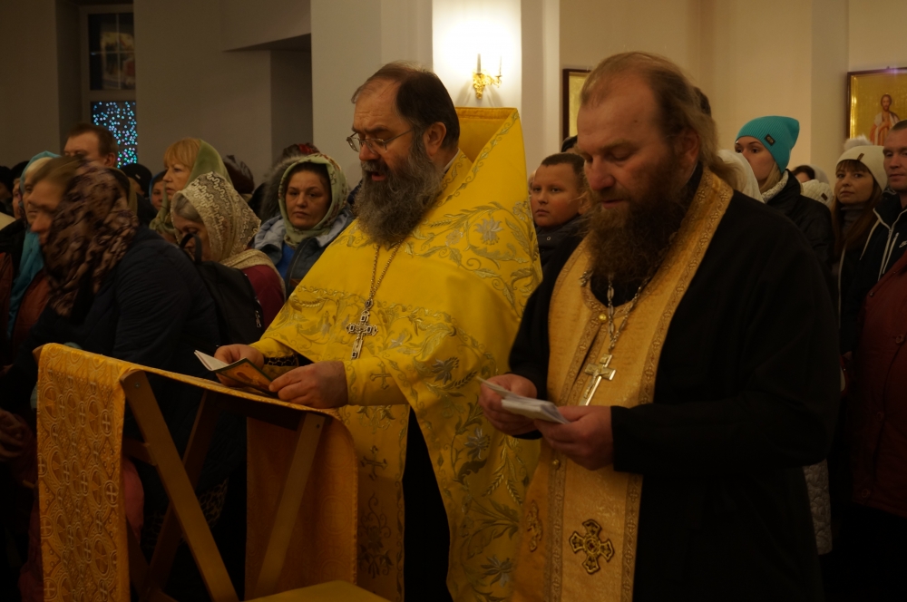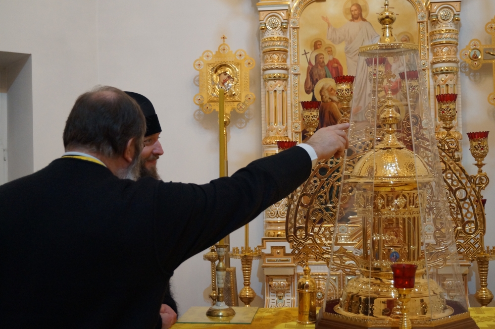 После встречи ковчега к собравшимся обратился настоятель собора протоиерей Василий Мовчанюк. Батюшка выразил особую благодарность протоиерею Валерию Керничному, клирику Свято-Троицкого женского монастыря г. Симферополя, за то, что батюшка согласился сопроводить святыню в Георгиевский собор, несмотря на позднее время. А также отец Василий напомнил всем с какой молитвой мы должны предстоять и поклоняться святому угоднику Божию.