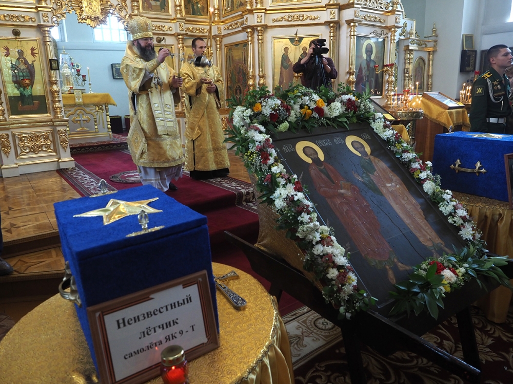 По возвращении в храм митрополит Смоленский и Дорогобужский Исидор совершил чин отпевания воинов, чьи останки удалость поднять бойцам поисковых отрядов во время очередной Вахты Памяти.